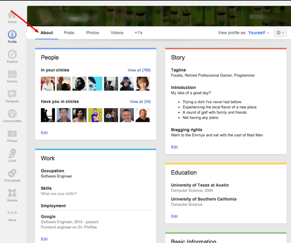 The ‘About' tab will have separate cards that will include categories like Story, Places, Links, etc. You will be able to edit all through a prominently displayed edit link.